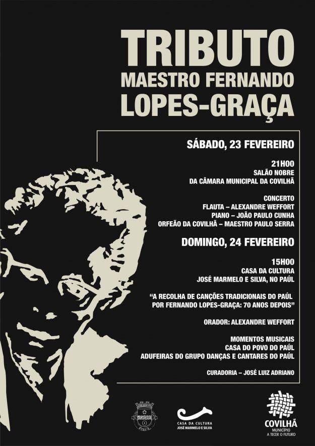 No sábado (21 horas) há um recital com as principais obras do compositor interpretadas por Alexandre Weffort (flauta), João Paulo Cunha (piano) e o Orfeão da Covilhã, sob a direção do maestro Paulo Serra. O concerto acontece no salão nobre da autarquia. Para domingo (15 horas) está prevista uma palestra sobre “Canções Tradicionais do Paul por Fernando Lopes-Graça: 70 Anos”, por Alexandre Weffort. A sessão decorre na Casa da Cultura José Marmelo e Silva, naquela vila, e será complementada com as atuações das Adufeiras da Casa do Povo do Paul e das Adufeiras do Grupo de Danças e Cantares do Paul. Fernando Lopes-Graça criou numerosas obras para orquestra, piano, bailados, música coral, ciclos de canções, etc. De orientação nacionalista, o compositor procurou aliar a grande tradição da música clássica e orquestral aos elementos rítmicos e melódicos do folclore português, ao qual dedicou vários estudos.