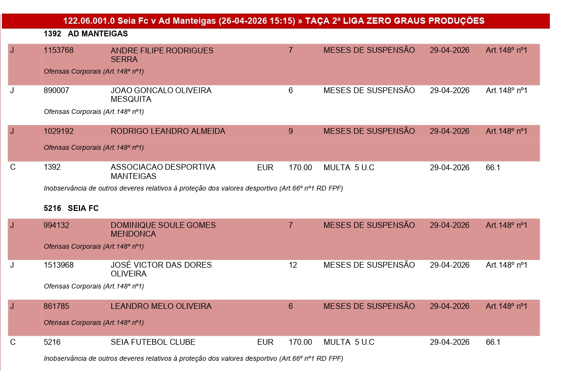 Assim sendo, na equipa da Associação Desportiva de Manteigas, o atleta André Serra foi castigado com 7 meses de suspensão, segue-se João Mesquita com 6 meses de suspensão e Rodrigo Almeida fica 9 meses fora dos relvados. Já à AD Manteigas foi aplicada uma multa de 170 euros.