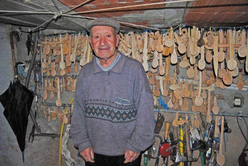 Com o recurso a navalhas de vários tamanhos, o artesão raspa e molda colheres de pau e “tasgas” para as coleiras do gado (nome tradicional dado a pequenas peças de madeira, semelhantes a colheres, que encaixam lateralmente no couro das coleiras dos animais). «Começo com um pedaço de madeira que vou raspando até obter a forma que quero, depois aperfeiçoo e cravo pequenos desenhos com a navalha, conforme me apetece», refere. Além disso esculpe também facas artesanais e badalos, que incorpora nos tradicionais chocalhos. Nascido em 1942, José Galvão vive na vila serrana há 51 anos. Natural de Alvoco da Serra, do outro lado da Serra da Estrela, no concelho Seia, o já reformado trabalhador fabril, mudou-se para esta freguesia no concelho da Covilhã após o casamento, em 1968.