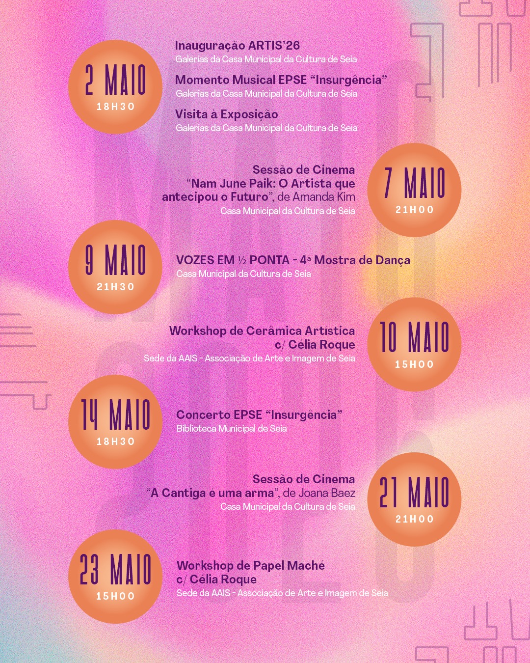 Há sete atividades marcadas para o mês de maio. A primeira está agendada para sexta-feira, pelas 18h30 é inaugurada a ARTIS’26 nas Galerias da Casa Municipal da Cultura de Seia, segue-se o momento musical EPSE “Insurgência” e uma visita à exposição.