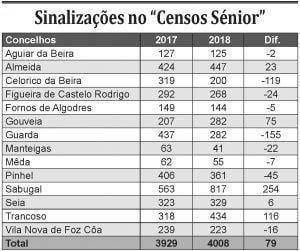 Almeida, com 447 casos (mais 23 que em 2017), Trancoso, com 434 (mais 116), Pinhel, com 361 (menos 45), e Seia, com 329 (mais 6), são outros municípios com mais casos. Já Manteigas, com 41 (menos 22), e Mêda, com 55 (menos 7), são os municípios com menos idosos sozinhos e/ou isolados. Nesta atualização dos registos e identificação de novas situações relativamente ao ano anterior, a GNR assinalou ainda menos dois casos em Aguiar da Beira (125), menos 119 em Celorico da Beira (200), menos 24 em Figueira de Castelo Rodrigo (268), menos cinco em Fornos de Algodres (144) e mais 75 em Gouveia (282). Na Guarda as patrulhas sinalizaram, em outubro passado, menos 155 pessoas nessas condições (282) e em Vila Nova de Foz Côa foram menos 16 (223). No total distrital, a Guarda tinha 4.008 idosos a viver sozinhos, mais 79 que em 2017, e passou a ser o segundo distrito com mais situações identificadas nos “Censos Sénior”.