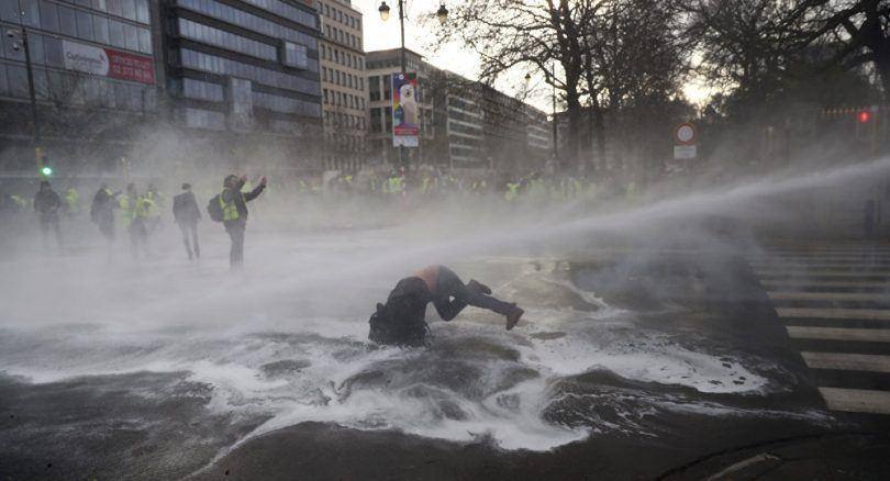 A polícia belga ripostou com canhões de água para fazer dispersar os manifestantes e interpelaram cerca de 60 pessoas que transportavam objetos proibidos, como facas e petardos. Os confrontos ocorreram cerca das 13h30 (12h30 de Lisboa) e a manifestação, que começou duas horas antes, paralisou o tráfego no centro de Bruxelas. Os “coletes amarelos” tentaram por diversas vezes aproximarem-se de edifícios públicos, que estavam defendidos por cordões policiais e gritaram palavras de ordem contra o Governo liderado pelo liberal Charles Michel.