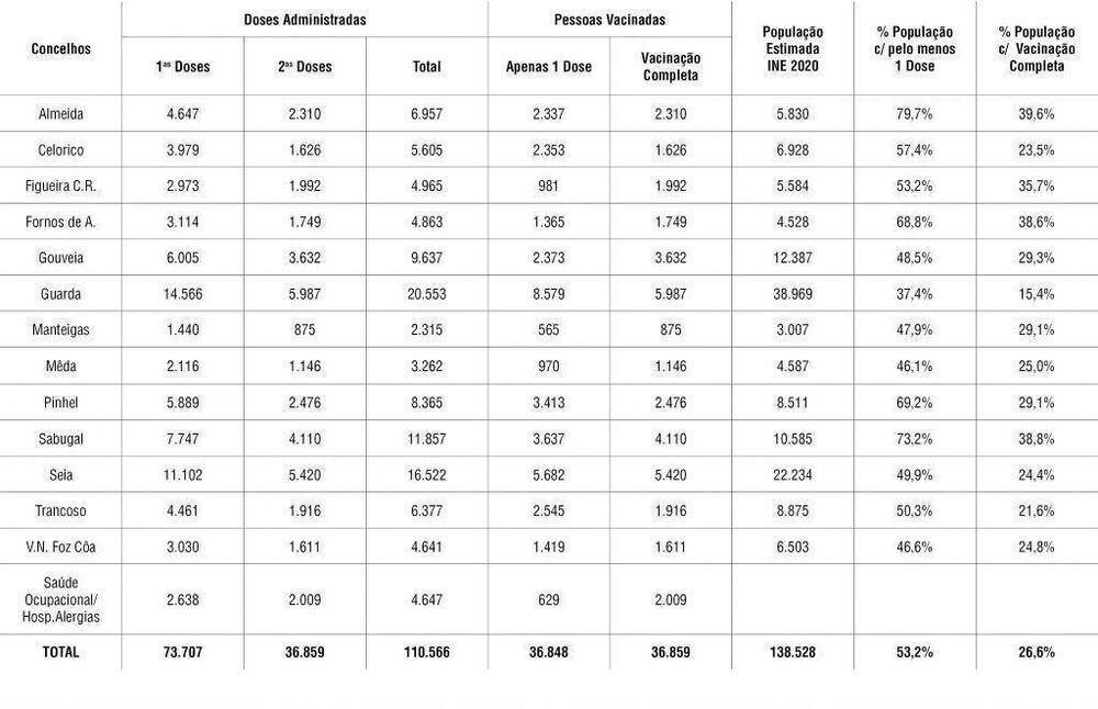 Almeida, Sabugal e Pinhel são os concelhos com maior percentagem de primeiras doses administradas com 79,7 por cento 73,2 por cento e 69,2 por cento, respetivamente. Com a vacinação completa Almeida já tem 39,6 por cento da população, Sabugal com 38,8 por cento e Fornos de Algodres com 38,6 por cento. O município da Guarda é o que se encontra pior no que toca à percentagem de população vacinada. Apenas 15,4 por cento da população do concelho guardense já tem a vacinação completa. O diretor clínico para Cuidados de Saúde Primários diz que apesar dessa percentagem «o número de vacinas administradas na Guarda é muito superior a Almeida» e isso «tem a ver com o número de utentes a vacinar» em cada município, clarifica António Serra.