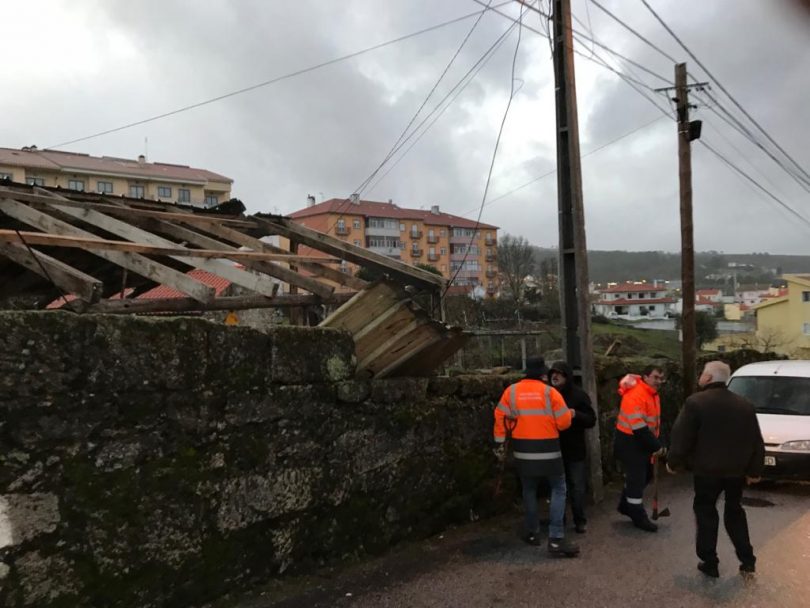 O trânsito está cortado enquanto a proteção civil retira o material derrubado pelo vento, nomeadamente as chapas de zinco espalhadas pela rua.