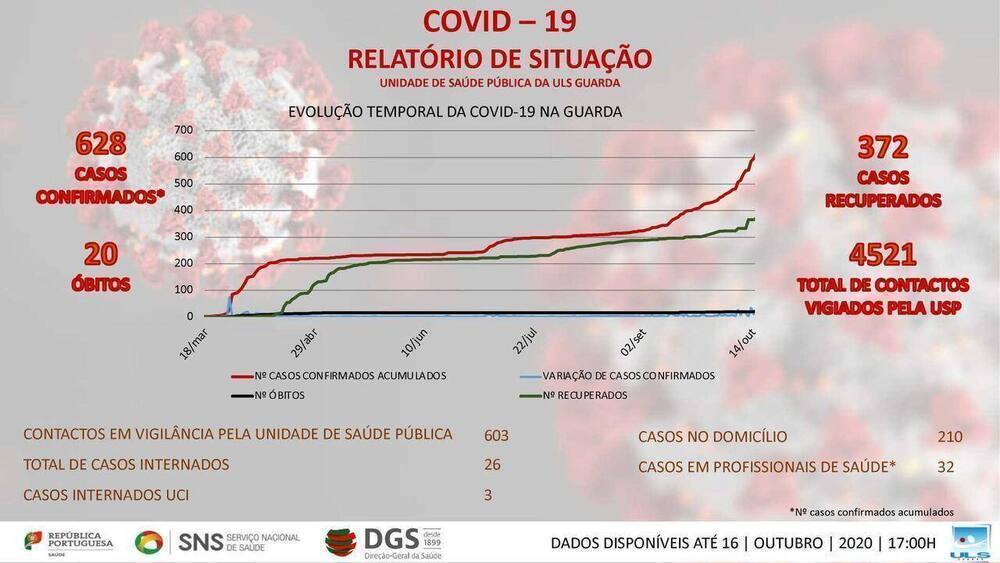 Em dois dias houve mais 33 casos de Covid-19 na área da Unidade Local de Saúde (ULS) da Guarda, que registava esta sexta-feira um total acumulado de 628 infetados (tinham sido 595 no dia 14).